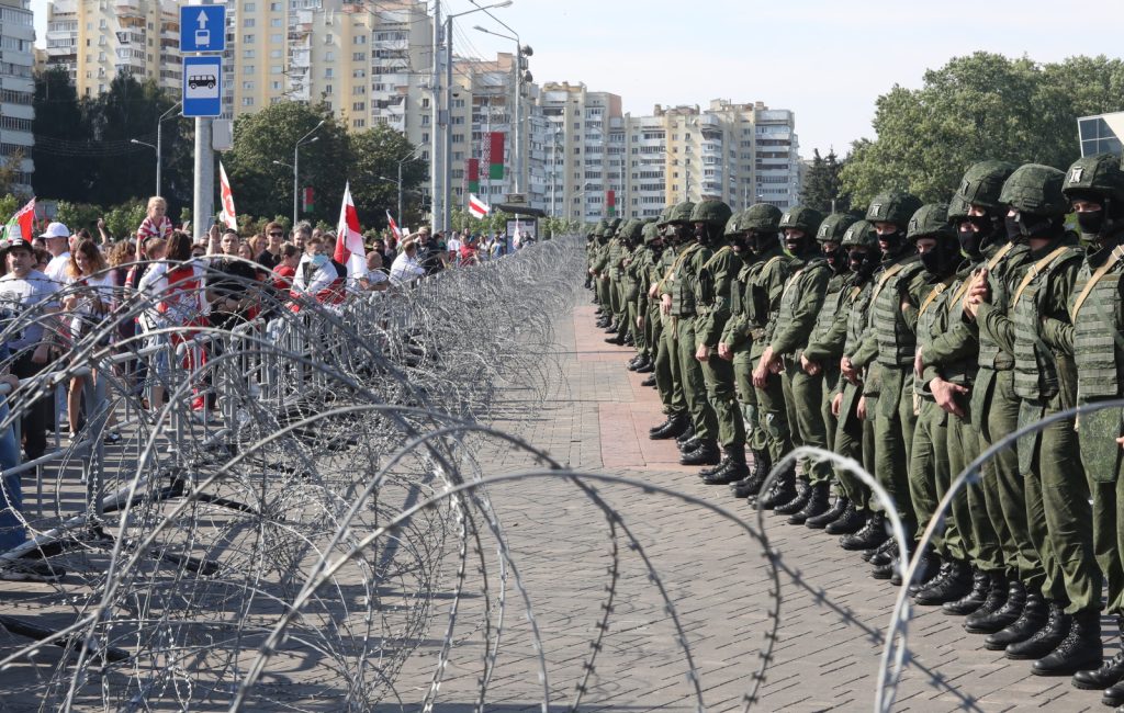 Police stand behind a barbed wire as they block the road during a protest rally against the results of the presidential elections, in Minsk, Belarus, 30 August 2020. Opposition protests in Belarus continue against alleges poll-rigging and police violence at protests following election results claiming that president Lukashenko had won a landslide victory in the 09 August elections. EPA/STRINGER Dostawca: PAP/EPA.